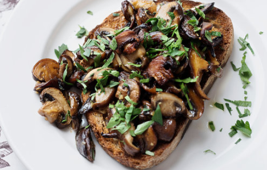 Triple serve of sauteed organic mushrooms infused with basil and served on toasted sourdough